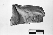 | Description: | Traces of white paint. Grayish buff clay. ADDENDA: Fragment from the waist of draped figure, holding cornucopia (?). Much worn surface. | |