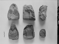 | Description: | One side only remains, and that broken away above. Top rail of throne projects. Goddess type. Very massive. Flaky clay fired dark gray at the core; buff on the surface. | |