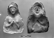 | Description: | Broken away below waist; chipped elsewhere. A figure holding a dove to her bosom in her right hand. Very massive; features indistinct. Flaky clay fired dark gray at core; buff on surface. | |