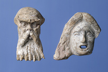 | Description: | Face complete; break below chin, at back and hair at left. Hair parted in center hanging down in curls. Mouth pierced. Two holes through top of head. White paint on face, red on hair and lips, trace of blue in eye. Red brown clay. Cf. Delos XXIII, p. 266, pl. 94, no. 1240. ADDENDA, O. Theophanopoulou, 1992: White slip all over the front. Creamy white paint on the face. | |