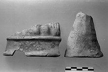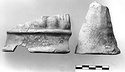 | Description: | Both pieces have an original lower edge: fragment a) front, fragment b) back. Fragment a) from the base of a large draped figure or figures. A plain wide band at bottom is separated from the subject proper by a ridge. Above, several bumps-rocky background- on to which folds of drapery fall. Fragment b) at the back, the ridge is not carried around, but roughly finished drapery carries down to bottom. White engobe beneath the color. Soft light, yellow buff clay. | |