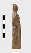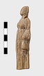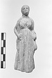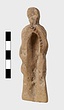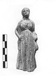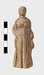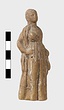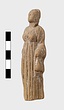 | Description: | Complete. The figure wears a straight high-girted chiton, and a shawl over her shoulders. Her right hand rests on her hip; in her left she seems to be holding a log-like object (perhaps only one fold of cloak ?). Her hair is dressed in melon-waves, with a braid (?) around the back of the head. Mould-made; back unmoulded, but hollow where pressed into mould. Many traces of white color. Yellow-buff clay. | |