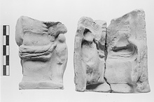 | Description: | Broken off above, mended from two pieces. Mold for a figure beside whom stands a small child. The mold seems to be part for the back part of the figurine, showing a plain bench or rock on which the figure sits, heavy folds of drapery at the hips, and part of the back. The child appears to be standing sideways, at the figure 's right. Pink to buff clay. Tabs outside. | |