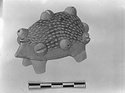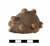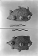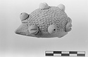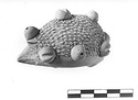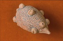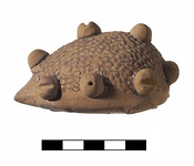 The animal's quills are indicated by small rectangular knobs. Attached to his back and sides are nine (originally ten) roughly hemispherical knobs, six of them with a deep groove across the top, others with a small deep hole.