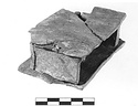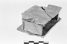 | Description: | First interpretation: shallow rectangular box, open at the back. Fragments missing. Broad flat projecting base and top. Traces of an object that stood on top. White color and traces of pale blue. ADDENDA: Traces of the figure that stood on top. | |