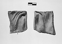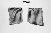 | Description: | Left edge preserved; broken at top, bottom and right. Figure moving right, preserved from waist to knee. Gray buff clay. Cf. Hesperia 64 (1995), p. 450, n. 208; p. 459, n. 248. | |