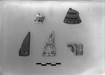 | Description: | Fragment from edge of plaque. At edge of plaque, border of two narrow red stripes with blue between. Within, bit of sharply twisting snake, red outlined with blue dots. Red and blue pigment on white ground. Back unpainted. Buff clay. | |