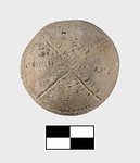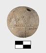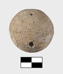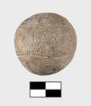 It has incised filled decoration. Pattern mostly in seam motif: lines bordered by rows of dots. Zone round center in seam line, zigzag. Four seam lines alternating with four plain rows of dots radiate from above and below to meet borders of zone. Traces of blue paint (?).
