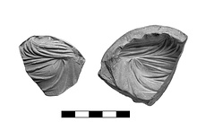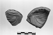 | Description: | Mold for part of the upper left side of a figure. Finished edge preserved at the top. Figure wrapped in a cloak, its folds carefully rendered. Pink to buff clay. | |