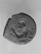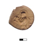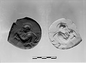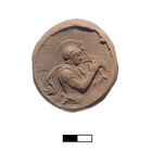 | Description: | Slightly chipped. On its face a (negative) impression of a warrior to right, from the waist up, shield and spear in left hand, right hand raised. He wears attic helmet with plume, short-sleeved tunic with kolpos, cuirass, chlamys, and short-belt. The surface of the original was slightly convex. Note a trace of a vertical border (?) in front of the warrior. The precision suggests a metal original, a cheek-piece from a helmet (?) | |