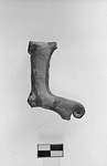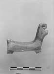 | Description: | Nose, tail and legs missing. The creature wears a curly topknot - a horn (?). Bands of red glaze down middle of back, around neck, tail and start of legs. Orange-pink clay. | |