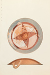 | Description: | About half preserved. Somewhat high convex shape gradually sloping into the rim. Red painted triangle on it (?). Strap near margin like those usually in center. Blue margin; narrow red and broad white bands round red center. Pinkish buff clay. | |
