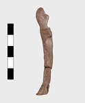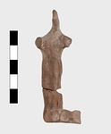 | Description: | Mended from two pieces; arms missing from shoulders. Lower and smeared against part of a continuous narrow base. Pinched bird-like head. Indication of drapery down front. Back plain. Traces of white color. Pink clay. | |