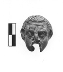 | Description: | Front part of mask with frown and short curls in widow 's peak. The join is oblique so that most of the top of the head is preserved. The mouth is completely perforated, suggesting a spout. Mould-made, hollow. Considerable traces of black color on hair and of white on face, (also traces of yellow ?). Clay pinkish buff to grayish. | |