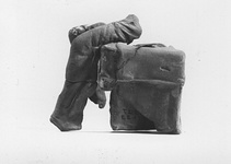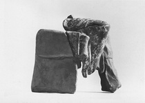 | Description: | Most of legs and part of seat preserved. A fragment preserving some of the seat at the figure 's left does not join directly. Part of large rectangular air-hole preserved at back of seat. The seat is a large rectangular affair with a turned post at either side in front. Remains of white on figure 's right leg and on seat. Buff clay. | |
