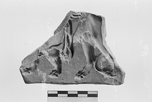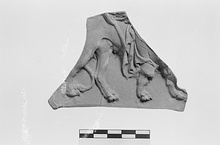 | Description: | The legs and the part of the body of a lion or panther walking right. Animal leg with drapery falling over is preserved, suggests it had rider (who perhaps holds a staff?). Part of the lower edge preserved. Pinkish-buff clay. ADDENDA Rider may be Cybele or Maenad or Dionysos with thyrsos. | |