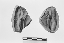 | Description: | Drapery for one side of a small standing female figure, preserved about from shoulder to mid-calf (?). Part of one side preserved. Plain surface at the right. From a mold for a relief (?). Cf. T 3935 | |