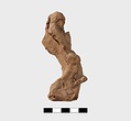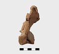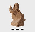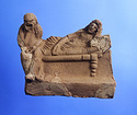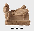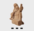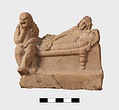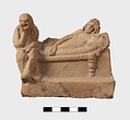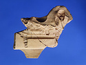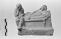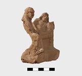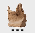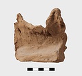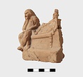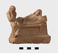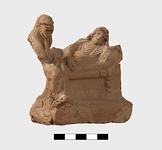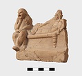 | Description: | Part of lower edge preserved, with one leg of a low table or couch. On a sort of a panel hanging from or just under the table and outlined in low relief in the mould, letters, also in low relief. Second fragment, joining, found. Full height of mold preserved; broken at left, and at lower right. Represented is a group of two figures, a woman on a couch, and a male figure wearing a comic mask seated on the couch at her feet (to the left in the positive). The woman holds a wreath in her right hand. The man in his left. In relief in the mold is the inscription: COMEDIA PYLADES written on the background beneath the couch. <graphic> | |