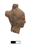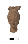 | Description: | The hair is drawn up into a bow-knot on the top of the head (or is this actually a bow?), and is gathered at the back in a plain projecting . Earrings. Hair indicated by straight and crosswise grooves and ridges. No traces of color. Pale buff clay. | |