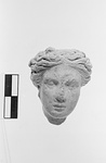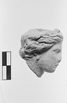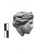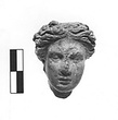 | Description: | Head with wavy hair parted in the middle and crowned with a small wreath. Broken off across the neck. No remains of color. Pink to buff clay. | |