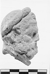 | Description: | Bearded head with heavy moustache and curling hair crowned by a drapery roll (rolled fillet). Broken off at neck. Hair worked behind. Traces of white, with red on face and hair and fillet. Light buff clay. ADDENDA Other uncatalogued fragments; cf. fragments in group drawer NN-Box 821. | |