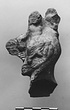 | Description: | A large cock, right; on its back, seated sideways, a child, with his left arm apparently around the bird's neck; in his right hand some object - a pot? ; drapery over his lower legs. The back plain, with sizable vent hole. The bottom part broken away at the front; a little of the finished edge preserved at the back. Broken and chipped around left side and top. Considerable remains of white, and a few traces of light red or orange color. Buff clay. ADDENDA Cf T 2008, probably Early Roman; Herakles deposit. | |