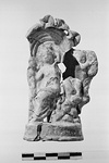 | Description: | On a oval base with projecting moulding top and bottom, Aphrodite seated on a rock, left; drapery over her knees, her head and upper body and head facing. To the right, standing on the rock, Eros, holding a mirror. The seated figure is framed by a shell-like niche finished with flowers around its top. Mended from many pieces; part of the base at the back, a large piece of the front, and chips, missing. Back plain, oval vent. Light buff clay with white on the front, and remains of color: red on the base, yellow on the rock, pink on the drapery. Copy of plastic vase. | |
