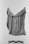 | Description: | Figure draped in chiton and short transparent himation. Mended from three pieces; part of bottom and both sides preserved; back entirely missing. Hard brittle fabric. Traces of white. Pinkish-buff clay. | |