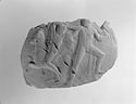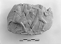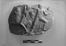 | Description: | Plaque with battle scene; youth attacking rider. Mended from four fragments; edge along top broken. Top of head of standing youth missing, and tip of shield which he holds on his left arm. Perhaps a trial relief from a metal worker 's mold (?) Cf. JdI 41 (1926), Rodenwaldt, Ein Toreutisches Meisterwerk. | |