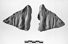 | Description: | Lower part of draped figure; a foot shows at left in positive. Worn and edges chipped. Back irregular. Pinkish-buff clay. | |