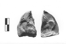 Description:   Fragment from small seated draped woman holding a tympanum (?).