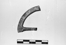 | Description: | Fragment from a four-spoked wheel; one quadrant mostly preserved. White slip; traces of black. Buff clay. | |