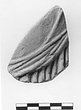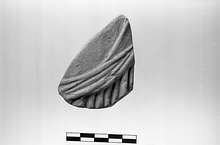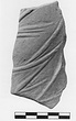 Description:   Fragment a), part of the body of a large standing draped figure, the drapery drawn tight in rather shallow diagonal folds.