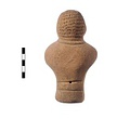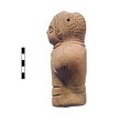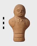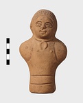 | Description: | Bust on small round base, surmounted by a gouged-style head. A necklace with pendent crescent around the neck. Four small vent holes: one on the top of the head, one on each side, and one in the back of the base. Hollow; mold made. No paint. Micaceous red clay. | |