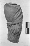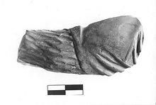 | Description: | Right leg and slightly bent knee of a standing figure, perhaps Papposilenos. Above a cloak; from the knee downward the leg irregularly grooved to represent shaggy trousers or pelt. Traces of burning. Hard buff clay. | |