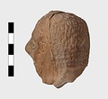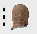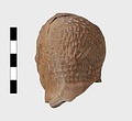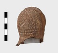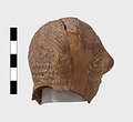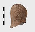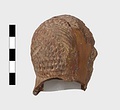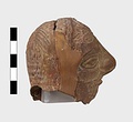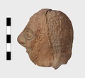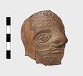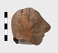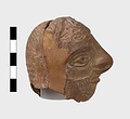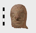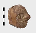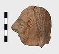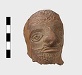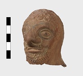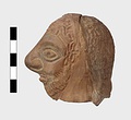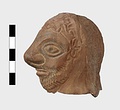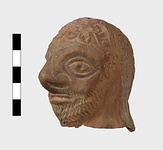 | Description: | Grotesque bearded head with thick nose and great lentoid eyes. Gouged style. Head only preserved; the front and back parts broken apart, and mended, with chips missing at sides. Traces of red, yellowish and black paint used to emphasize features and for hair (paint was clearer when first found). Red clay. | |