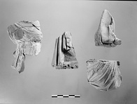 | Description: | Fragment from lower part of large figure. Mended from several fragments. Left foot projecting beneath drapery. Blue paint over white, with traces of gold leaf on the garment. Dull pinkish buff clay. | |
