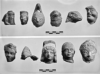 | Description: | First interpretation: head of female figurine. Front part of head. Part of right side of face broken away. The features are thick and heavy; the hair is gathered together into a knot above at the middle of the forehead. Traces of white paint. Red clay; buff slip. Cf. Levi (1926), Terrecotte figurate, p. 184, fig. 139. | |