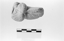| Description: | Standing draped female figure with cloak pulled close over right arm and hanging loose under left arm. In crook of left arm a swaddled infant. Two joining fragments. Broken about at knees; head lost. Traces of white slip; mould-made in two pieces. Buff clay. | |