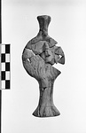 | Description: | Simple bird-faced, Φ-shaped figurine with flaring foot, disc-like body with breasts indicated and flat topped head. Applied circles of clay for eyes, applied pigtail hangs down back. Many small joining fragments; several small pieces missing filled out in plaster. Buff clay, red glaze in wavy vertical stripes except on top and back of head, where solid. | |