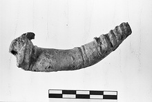 | Description: | A large cornucopia with a band of leaves near the bottom. The back flattened. Traces of pink and yellow over white. Buff clay, reddish at break. | |