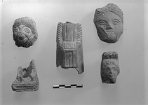 | Description: | Front part of large head. Surface damage round edges, especially right cheek. Fat face with large eyes and short nose. Hair in diagonal grooves. Remains of white paint. Coarse red clay, buff at surface. | |