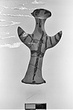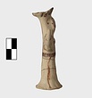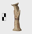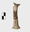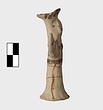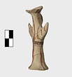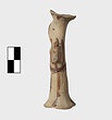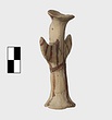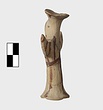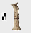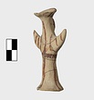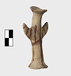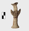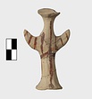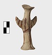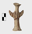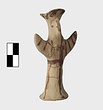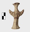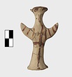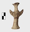Description:   Standing female figure; upraised arms covered by wing-sleeves. Flaring headdress, concave on top; shirt flares to form base of figure, concave beneath. Pellet breasts.