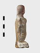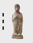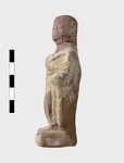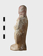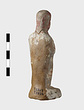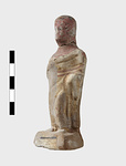 | Description: | Mended from two pieces. Male figure closely wrapped in a cloak which covers the arms. Heavy white paint on base and cloak, with horizontal red stripes and black stripe on base. Feet and face red; black on hair and eyes. Very little modelling. Brown clay. | |
