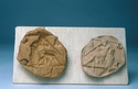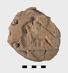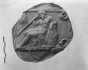 | Description: | The impression was taken from a relief worked in repousse on a plaque 0.073m. high and 0.105m. long. Intact, except for minor chips. Toward the left end were rivets (two out of an original three) for fastening the plaque to a backing; toward the right two loose rings. A bearded and long-haired warrior sits disconsolate to left on his cloak spread on a rock, spear in hand, shield with prominent Gorgoneion by his side; helmet in field. Perhaps Philoktetes (?). Fine buff clay. | |