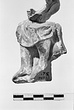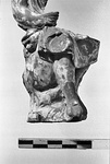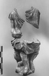 | Description: | Male figure seated on a rock; preserved from right shoulder to bottom; most of left side missing above knee. One non-joining fragment preserves part of drapery at front; another part of the rock, a third uncertain. Right hand rests in lap. Figure wears short full garment reaching to just below knees; and boots (?). Considerable remains of white engobe; and traces of red on boots. Dark pink clay. | |