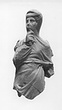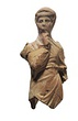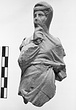 | Description: | Head and upper part of draped body of woman with veil covering head and lower part of face. Right hand holds veil under chin. In back of each shoulder a stub (attachment or chair or wings?). Mended from several fragments. Small non-joining fragment. Traces of red, white and yellow. Buff clay. | |