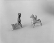 | Description: | Rider and head mended to body. Lower legs and all of right hand leg of horses missing. Head of rider is broken off and only stumps of his arms remain. Traces of rider's hands remain grasping horse's neck. Fragmentary. Rider's legs rest on hind flank of horse in the manner of a jockey. Tail of horse hangs down the right hind leg. Ears at crest of horse's head; punched holes for nostrils and left eye. Bands of black glaze decoration vertically down head neck and legs; horizontally around body. Wavy lines on chest and hind legs. Buff clay. | |