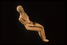 | Description: | Complete except for right wrist and hand, left forearm from below elbow, and left foot. Jointed. Moulmade. Articulated male seated nude. Has short curly hair. Well modelled musculature, front and back. Pierced at shoulders for articulated arms. Fragment a), right arm preserved from shoulder to wrist. Fragment b), left arm, shoulder to above elbow. Excellent workmanship. Buff clay with traces of red and white paint ADDENDA Damaged February 1972: head broken off and subsequently mended. | |