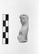 | Description: | Chip off bottom. Upper torso of frontal human figure with head held slightly to one side. Arms held next to body and bent at elbow. Thin strips of clay added to hair. Bottom part solid; lower part of figure probably casted separately. Buff fabric. ADDENDA RVN: Child Dionysos on goat. See also T 4142. | |